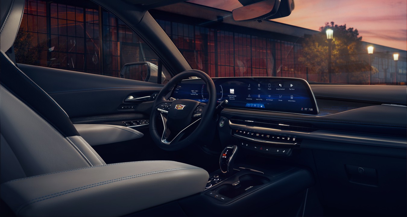 The 2025 Cadillac XT4 features a range of advanced technologies. Its standout component is a 33-inch curved diagonal color LED display, which includes the Google built-in infotainment system. This system provides easy access to navigation, connected apps, personalized profiles, and natural voice recognition. For convenient menu navigation, the XT4 is equipped with an intuitive rotary controller that has jog functionality. It also supports wireless Apple CarPlay and Android Auto, allowing seamless integration with your smartphone. To enhance your audio experience, the available AKG premium 14-speaker audio system delivers rich, immersive sound. Additionally, the available wireless charging pad keeps your devices powered up while you're on the go. The Technology Package also includes a Head-Up Display, offering augmented reality features to enhance your driving experience.