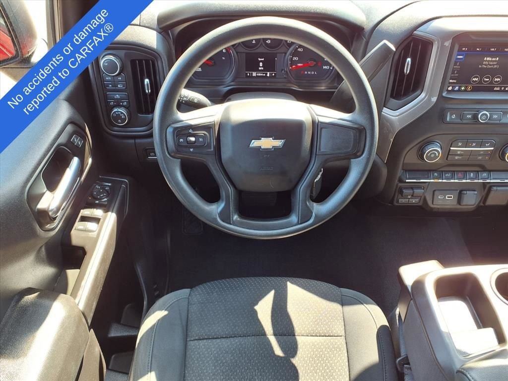 Our rugged, Accident Free, One Owner 2021 Chevrolet Silverado 1500 Custom Crew Cab 4X4 in Cherry Red Tintcoat is built to get the job done right! Powered by a 2.7L Turbo delivering 310hp paired with an 8 Speed Automatic transmission with tow/haul mode to maximize your pulling potential. This Four Wheel Drive truck also has a calm, responsive ride and returns nearly 22mpg on the highway. Standing tall, our Silverado shows fierce functionality with a bold grille, heated power mirrors, black recovery hooks, a CornerStep rear bumper, a spray-on bedliner, an EZ Lift & Lower tailgate, and terrific 20-inch alloy wheels.