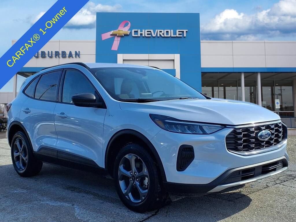 Our sporty, One Owner 2025 Ford Escape ST-Line AWD can turn heads as it takes on your days in Space Silver Metallic! Powered by a TurboCharged 1.5 Liter EcoBoost 3 Cylinder providing 180hp to an 8 Speed Automatic transmission for energetic everyday capability. Agile and versatile, this All Wheel Drive SUV also scores nearly 32mpg on the highway with responsive handling for urban adventures. For an athletic impression, our Escape is proudly presented with LED signature lighting, a power liftgate, chrome-tipped exhaust outlets, alloy wheels, and ST-Line upgrades like a black mesh grille, a large rear spoiler, an exclusive rear skid plate, and black roof rails.