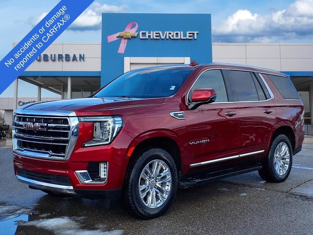 Strong and sophisticated, our Accident Free 2021 GMC Yukon SLT 4WD with the Premium and Rear Media & Nav Packages in Cayenne Red Tintcoat has the upscale capability your family needs! Powered by a 5.3 Liter EcoTec3 V8 delivering 355hp tethered to a 10 Speed Automatic transmission. This impressive Four Wheel Drive SUV is the real deal, with robust body-on-frame construction, a composed, confidence-inspiring ride, and the ability to see nearly 20mpg on the highway. An imposing presence, our rugged ride shows off a modern grille design with LED lighting, heated power mirrors, 20-inch alloy wheels, a panoramic sunroof, and a hands-free tailgate.
